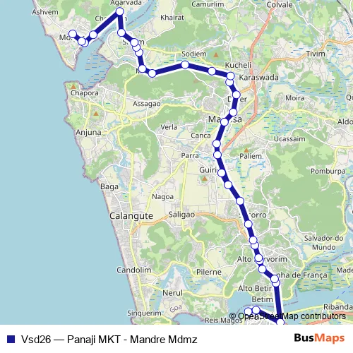 The first stop of the Vsd26 bus route is Panjim Promenade B and the last stop is Morjim School. Vsd26 (Panaji MKT - Mandre Mdmz) is operational during everyday.