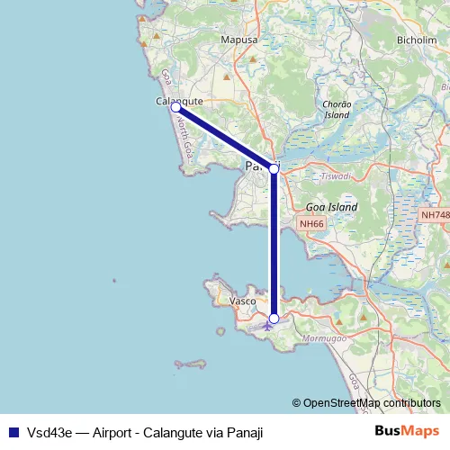 The first stop of the Vsd43e bus route is Dabolim Airport Terminal and the last stop is Calangute Football Ground. Vsd43e (Airport - Calangute via Panaji) is operational during everyday.
