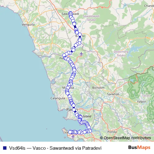 The first stop of the Vsd64is bus route is Sawantwadi Bus Stand Msrtc and the last stop is Vasco KTC Bus Stop. Vsd64is (Vasco - Sawantwadi via Patradevi) is operational during everyday.