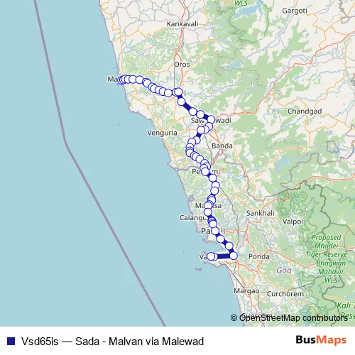 The first stop of the Vsd65is bus route is Malvan Bus Stand Msrtc and the last stop is Vasco KTC Bus Stand. Vsd65is (Sada - Malvan via Malewad) is operational during everyday.