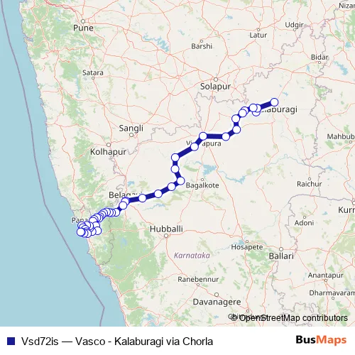 The first stop of the Vsd72is bus route is Gulbarga Central Bus Stand K.S.R.T.C. and the last stop is Vasco KTC Bus Stand. Vsd72is (Vasco - Kalaburagi via Chorla) is operational during everyday.