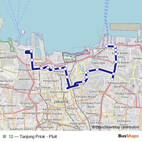 The first stop of the 12 bus route is Tanjung Priok and the last stop is Pluit. 12 (Tanjung Priok - Pluit) is operational during everyday.
