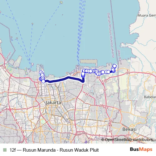Services on the 12f - Rusun Marunda - Rusun Waduk Pluit bus stop at 01:08 +1 on Monday, Tuesday, Wednesday, Thursday, Friday, Saturday, Sunday.