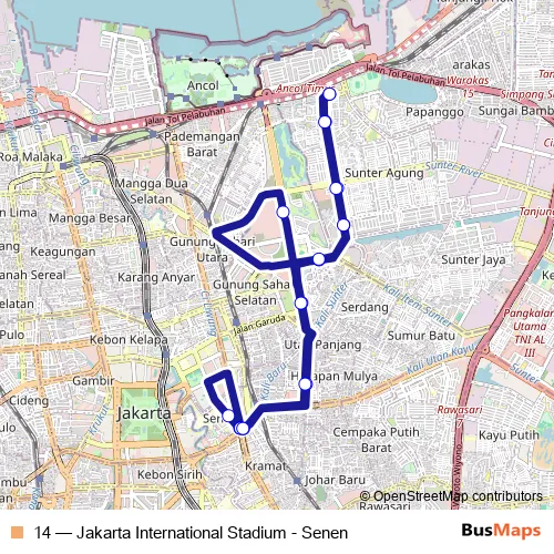 The first stop of the 14 bus route is Jakarta International Stadium and the last stop is Jakarta International Stadium. 14 (Jakarta International Stadium - Senen) is operational during everyday.
