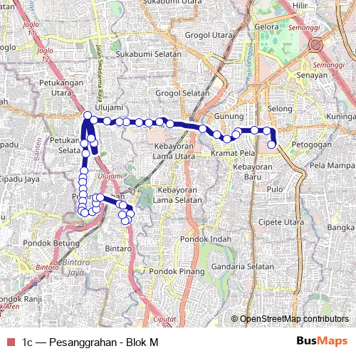 The first stop of the 1c bus route is Blok M Jalur 2 and the last stop is Bintaro Kodam. 1c (Pesanggrahan - Blok M) is operational during everyday.