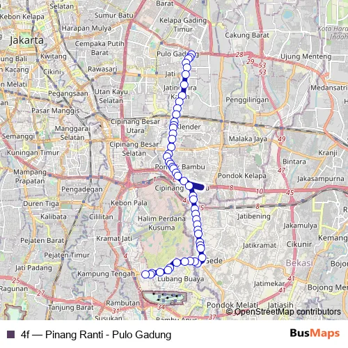 The first stop of the 4f bus route is Term. Pulo Gadung and the last stop is Term. Pinang Ranti. 4f (Pinang Ranti - Pulo Gadung) is operational during everyday.