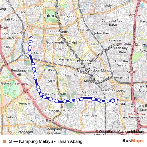 The first stop of the 5f bus route is St. Tebet 3 and the last stop is St. Tebet 3. 5f (Kampung Melayu - Tanah Abang) is operational during everyday.