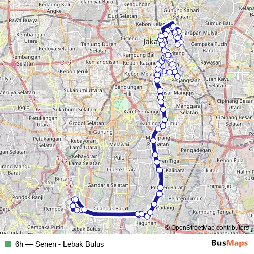 The first stop of the 6h bus route is Term. Senen and the last stop is Term. Senen. 6h (Senen - Lebak Bulus) is operational during everyday.