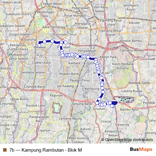 The first stop of the 7b bus route is Blok M Jalur 2 and the last stop is Kampung Rambutan 1. 7b (Kampung Rambutan - Blok M) is operational during everyday.
