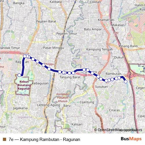The first stop of the 7e bus route is Kampung Rambutan 1 and the last stop is Ragunan. 7e (Kampung Rambutan - Ragunan) is operational during everyday.