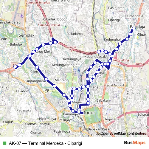 The first stop of the AK-07 bus route is Terminal Bubulak and the last stop is Terminal Bubulak. AK-07 (Terminal Merdeka - Ciparigi) is operational during everyday.