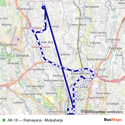 The first stop of the AK-18 bus route is Villa Mutiara Bogor 1 and the last stop is Villa Mutiara Bogor 1. AK-18 (Ramayana - Mulyaharja) is operational during everyday.