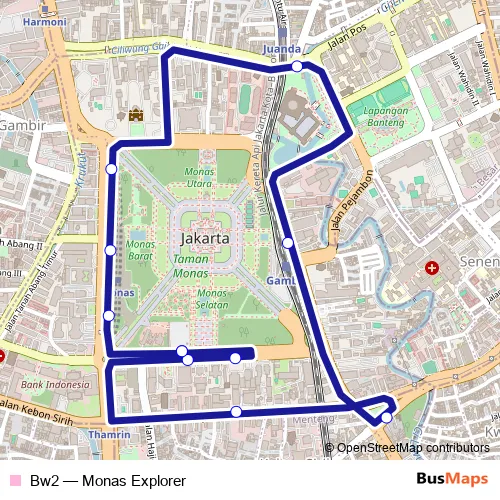 The first stop of the Bw2 bus route is Irti and the last stop is Irti. Bw2 (Monas Explorer) is operational during everyday.
