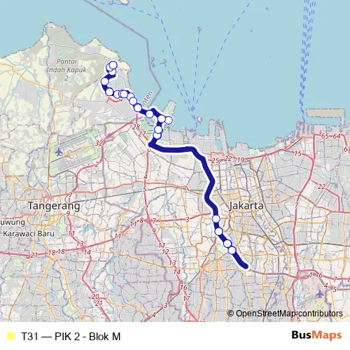 The first stop of the T31 bus route is Shelter PIK 2 and the last stop is Blok M Jalur 5. T31 (PIK 2 - Blok M) is operational during everyday.