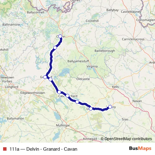 The first stop of the 111a bus route is Cavan Bus Station and the last stop is Athboy. 111a (Delvin - Granard - Cavan) is operational during everyday.
