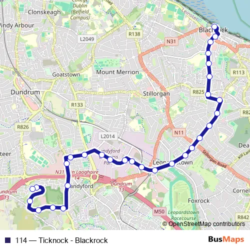 The first stop of the 114 bus route is Blackrock Station and the last stop is Rockview. 114 (Ticknock - Blackrock) is operational during everyday.