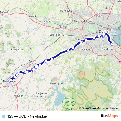The first stop of the 125 bus route is Newbridge and the last stop is UCD Belfield Campus. 125 (UCD - Newbridge) is operational during on weekdays.