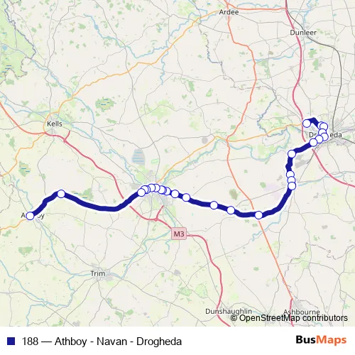 The first stop of the 188 bus route is M1 Retail Park and the last stop is Athboy. 188 (Athboy - Navan - Drogheda) is operational during everyday.