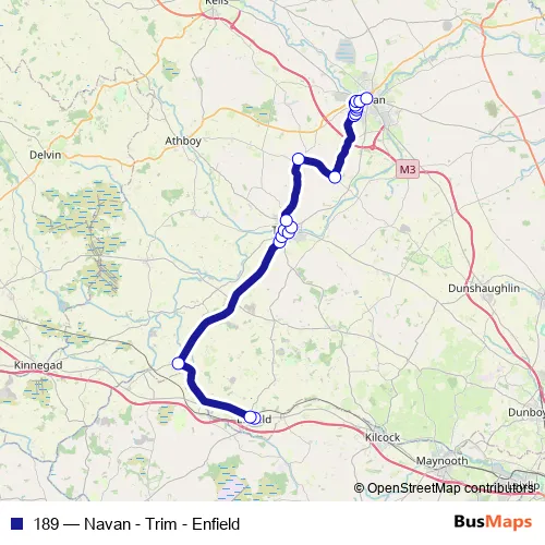 The first stop of the 189 bus route is Enfield and the last stop is Navan. 189 (Navan - Trim - Enfield) is operational during everyday.