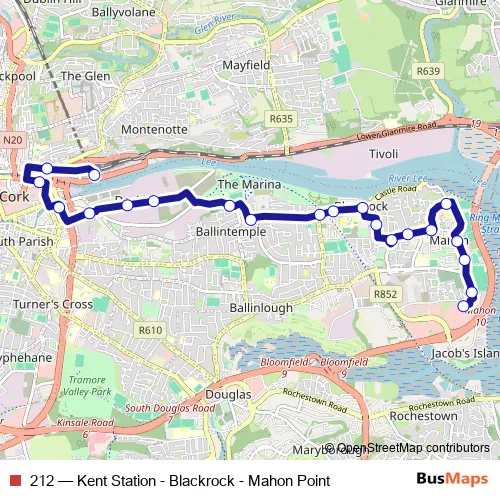 The first stop of the 212 bus route is Mahon Point East and the last stop is Cork Kent Station. 212 (Kent Station - Blackrock - Mahon Point) is operational during everyday.