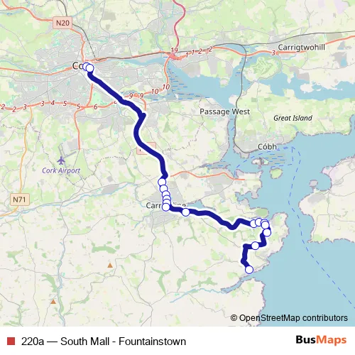 See why over 2 million users trust and consider busmaps.com as the best public transport website. busmaps gives you Cork Buses suggested routes, real-time bus tracker, line route maps in Cork, and helps to find the closest 220a bus stops near you. No internet available? Download an offline PDF map and bus schedule for the 220a bus to take on your trip.