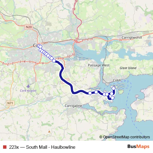 The first stop of the 223x bus route is South Mall (Opp Cork Passport Office) and the last stop is Haulbowline Island. 223x (South Mall - Haulbowline) is operational during on weekdays.