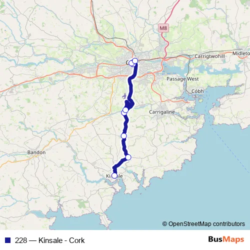 The first stop of the 228 bus route is Kinsale and the last stop is Cork Saint Patrick's Quay. 228 (Kinsale - Cork) is operational during everyday.
