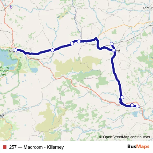 The first stop of the 257 bus route is Macroom and the last stop is Killarney Bus Station. 257 (Macroom - Killarney) is operational during everyday.