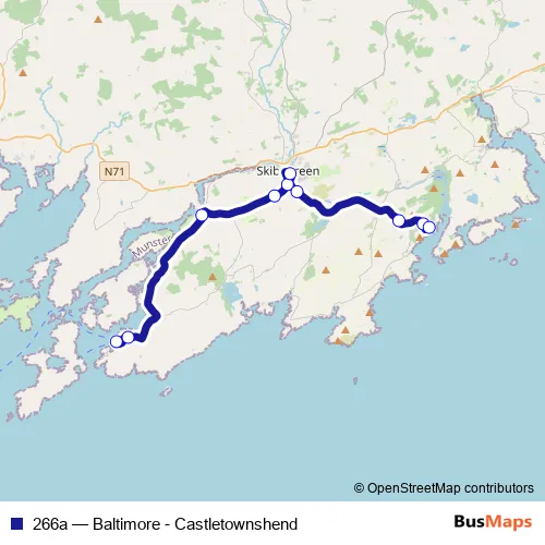 The first stop of the 266a bus route is Baltimore and the last stop is Castletownshend. 266a (Baltimore - Castletownshend) is operational during everyday.