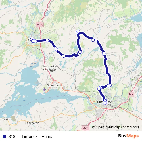 The first stop of the 318 bus route is Ennis Friars Walk and the last stop is Limerick Colbert Station. 318 (Limerick - Ennis) is operational during everyday.