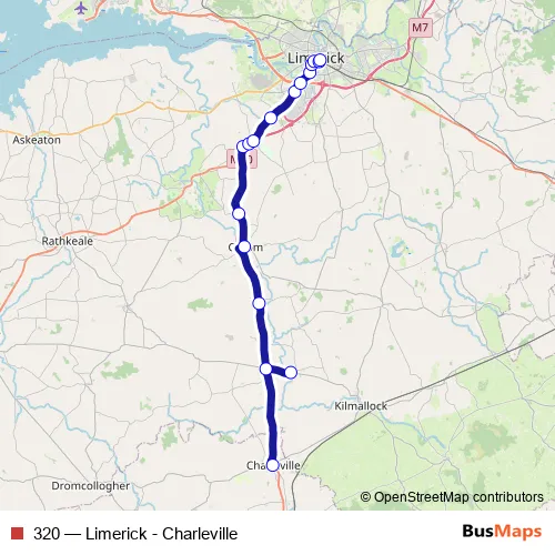 The first stop of the 320 bus route is Charleville and the last stop is Limerick Colbert Station. 320 (Limerick - Charleville) is operational during everyday.