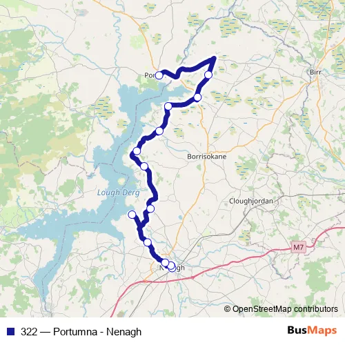 The first stop of the 322 bus route is Nenagh Station and the last stop is Portumna. 322 (Portumna - Nenagh) is operational during everyday.