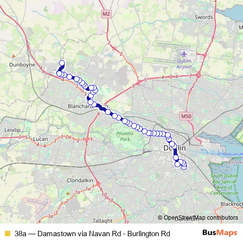 See why over 2 million users trust and consider busmaps.com as the best public transport website. busmaps gives you Dublin Buses suggested routes, real-time bus tracker, line route maps in Dublin, and helps to find the closest 38a bus stops near you. No internet available? Download an offline PDF map and bus schedule for the 38a bus to take on your trip.