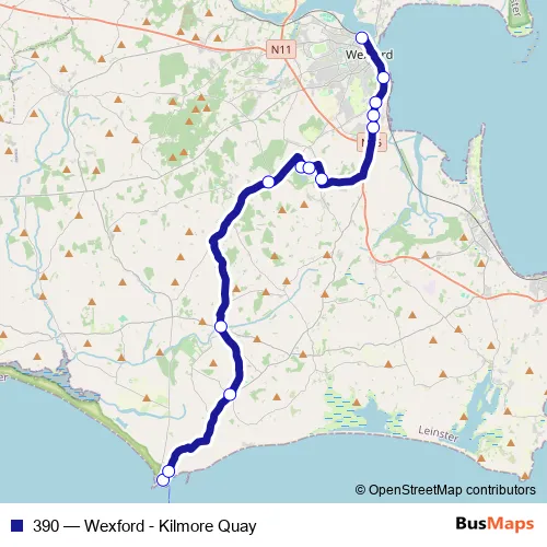 The first stop of the 390 bus route is Kilmore Quay and the last stop is Wexford O'Hanrahan Station. 390 (Wexford - Kilmore Quay) is operational during everyday.