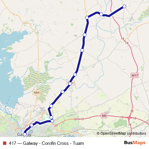 The first stop of the 417 bus route is Ballynastuckaun and the last stop is Galway Ceannt Station. 417 (Galway - Corofin Cross - Tuam) is operational during on weekdays.