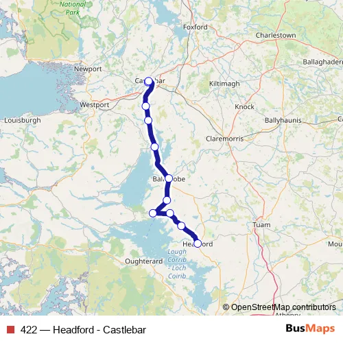The first stop of the 422 bus route is Headford (Joyce Supermarket) and the last stop is Castlebar. 422 (Headford - Castlebar) is operational during everyday.