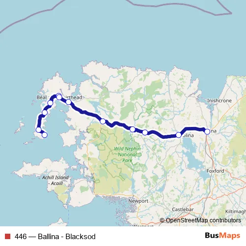 The first stop of the 446 bus route is An Fód Dubh and the last stop is Ballina Bus Station. 446 (Ballina - Blacksod) is operational during everyday.
