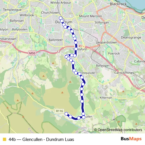 The first stop of the 44b bus route is Dundrum Luas and the last stop is Ballybrack Road. 44b (Glencullen - Dundrum Luas) is operational during on weekdays.