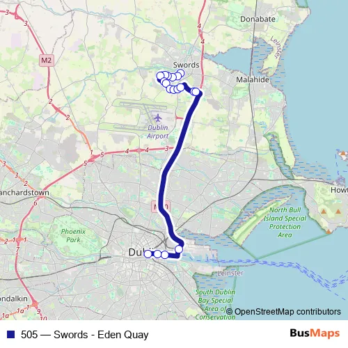 See why over 2 million users trust and consider busmaps.com as the best public transport website. busmaps gives you Swords Buses suggested routes, real-time bus tracker, line route maps in Swords, and helps to find the closest 505 bus stops near you. No internet available? Download an offline PDF map and bus schedule for the 505 bus to take on your trip.