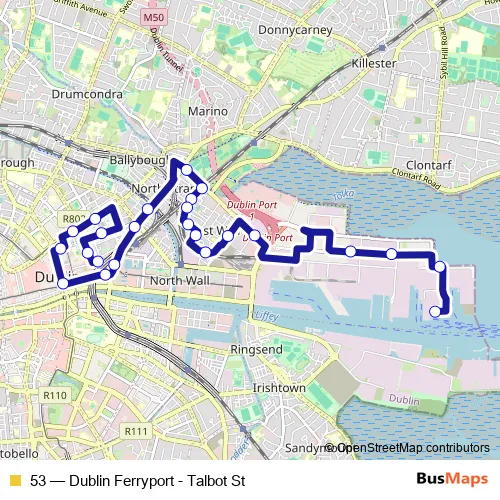 The first stop of the 53 bus route is Talbot Street East and the last stop is Dublin Ferry Port Terminal 1. 53 (Dublin Ferryport - Talbot St) is operational during everyday.