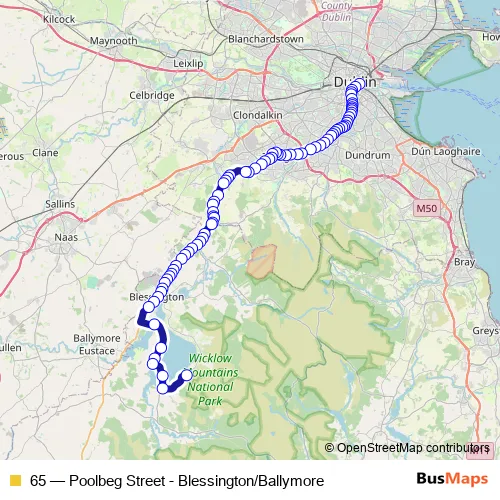 The first stop of the 65 bus route is Poolbeg Street and the last stop is Blessington. 65 (Poolbeg Street - Blessington/Ballymore) is operational during everyday.
