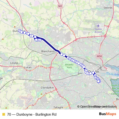 The first stop of the 70 bus route is Dunboyne Village and the last stop is Burlington Road. 70 (Dunboyne - Burlington Rd) is operational during everyday.
