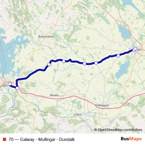 The first stop of the 70 bus route is Mullingar Station and the last stop is Athlone (Bus Station). 70 (Galway - Mullingar - Dundalk) is operational during everyday.