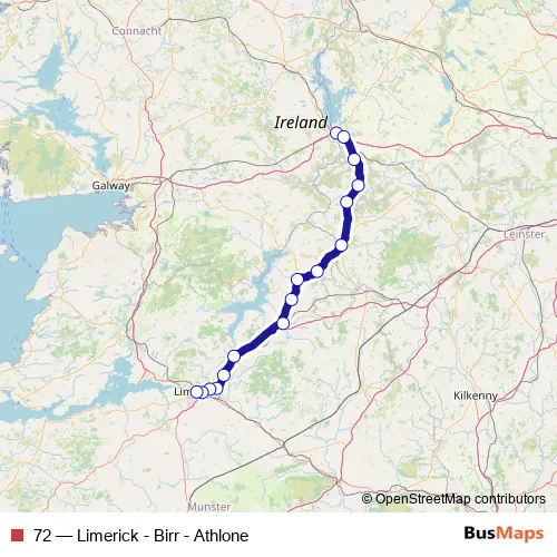 The first stop of the 72 bus route is Athlone (Bus Station) and the last stop is Limerick Colbert Station. 72 (Limerick - Birr - Athlone) is operational during everyday.