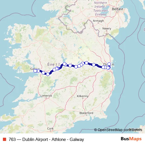 The first stop of the 763 bus route is Dublin Airport Zone 11 and the last stop is Galway Coach Station. 763 (Dublin Airport - Athlone - Galway) is operational during everyday.