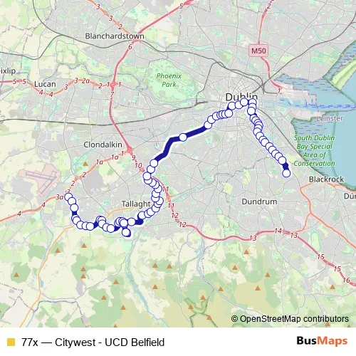 The first stop of the 77x bus route is Citywest Road North and the last stop is UCD Glenomena. 77x (Citywest - UCD Belfield) is operational during on weekdays.