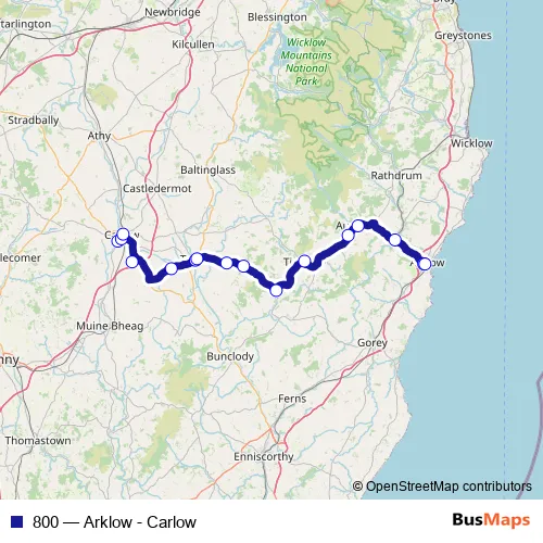 The first stop of the 800 bus route is Setu Carlow and the last stop is Arklow Train Station. 800 (Arklow - Carlow) is operational during everyday.
