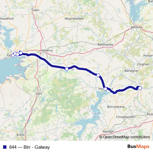 The first stop of the 844 bus route is Merchants Road and the last stop is Birr. 844 (Birr - Galway) is operational during on weekends.