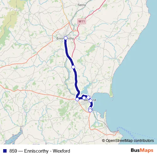 The first stop of the 859 bus route is Enniscorthy and the last stop is Wexford Business Park. 859 (Enniscorthy - Wexford) is operational during on weekdays.