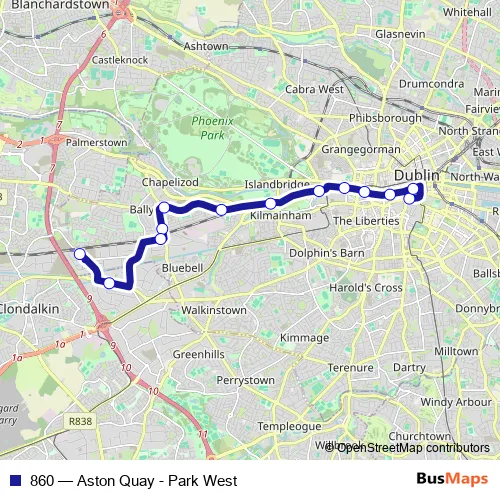 The first stop of the 860 bus route is College Green and the last stop is Park West Hotel. 860 (Aston Quay - Park West) is operational during on weekdays.